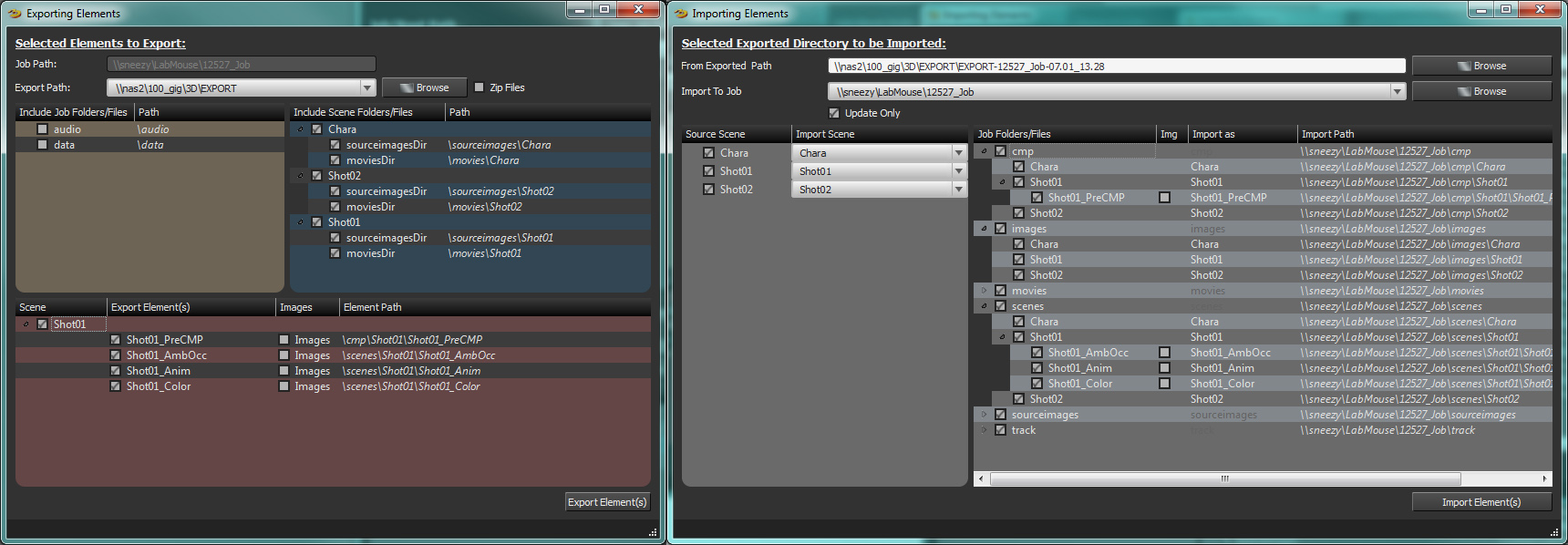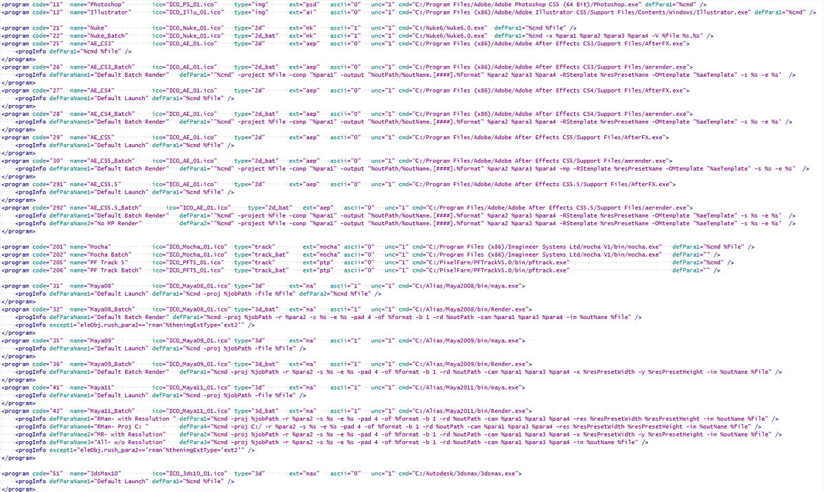 For ease of support and maintenance, all the preferences and templates can be easily changed by editing a simple corresponding xml file. JT3 also uses relative paths with nested xml file for each job/shot/element, so a whole project can be copied to a different server or machine without breaking anything.